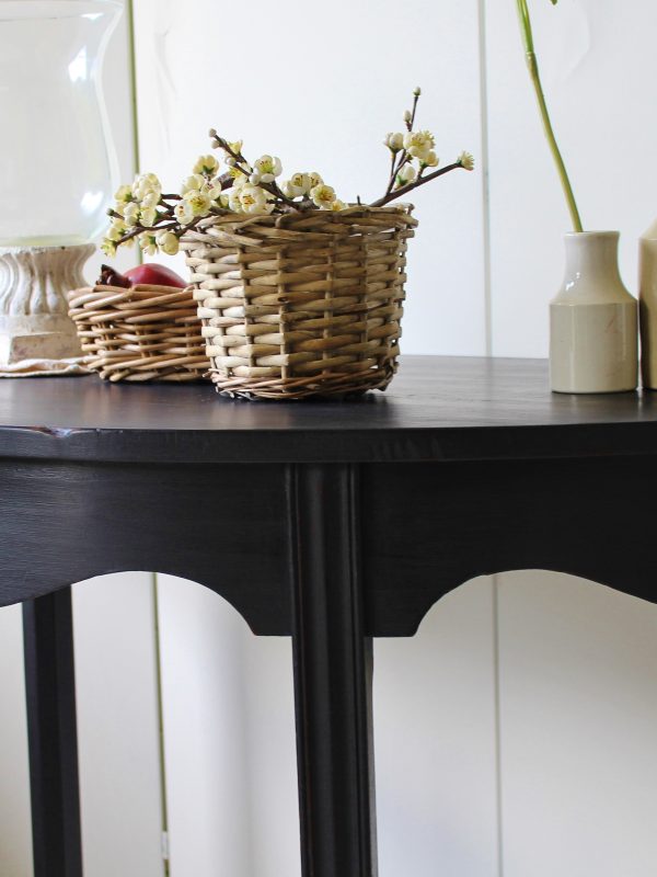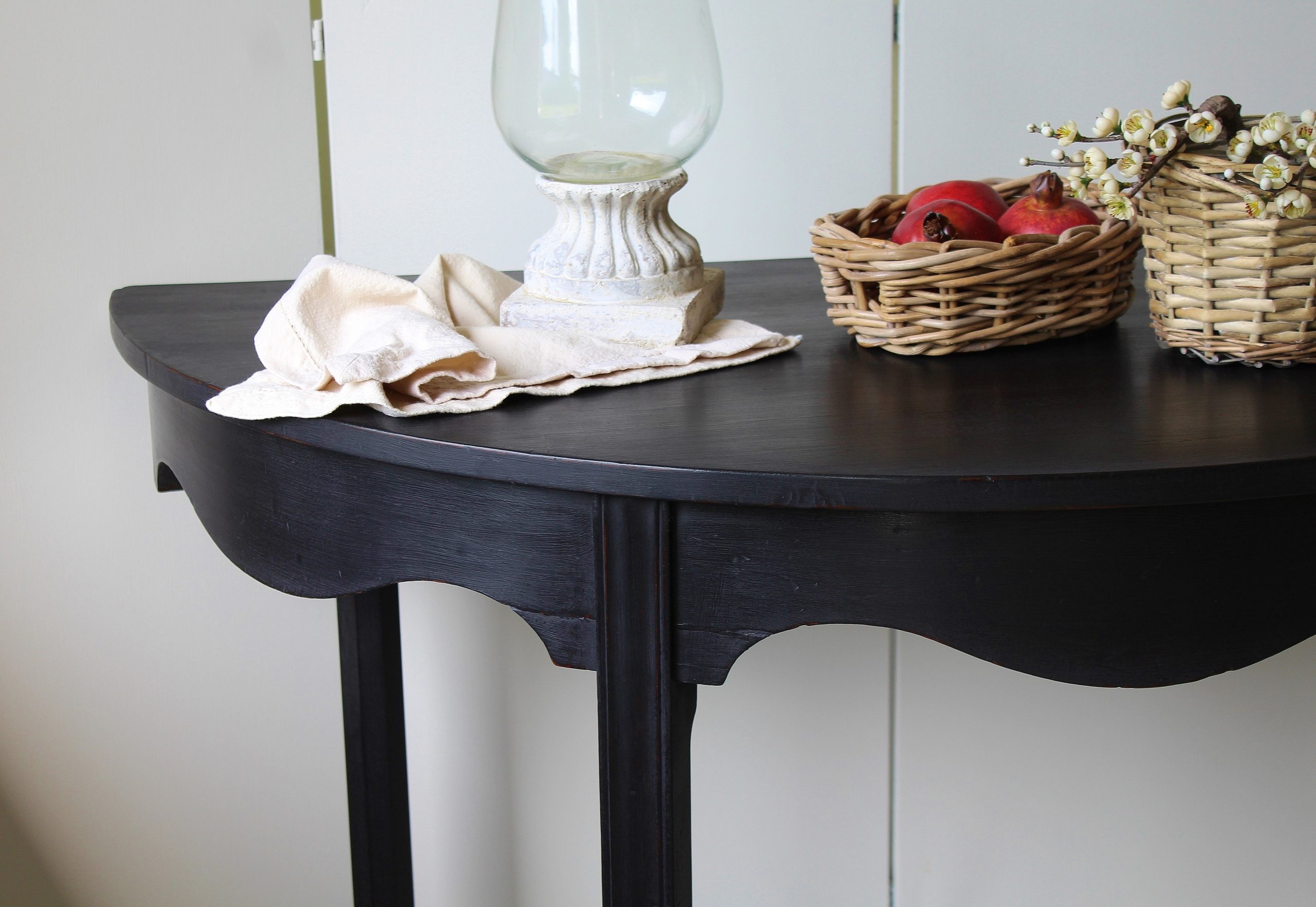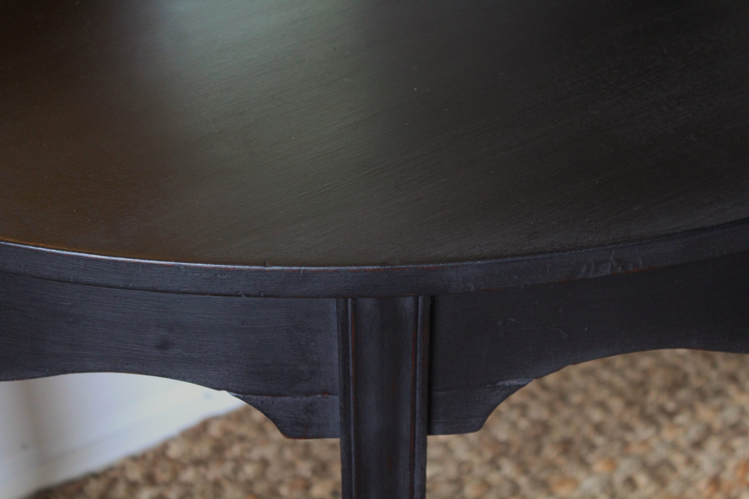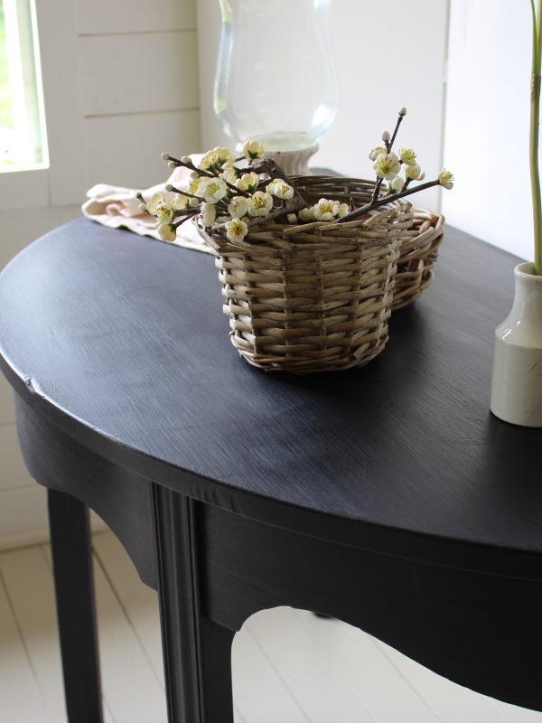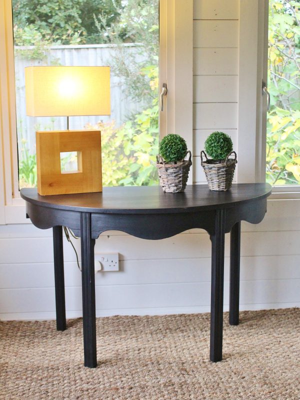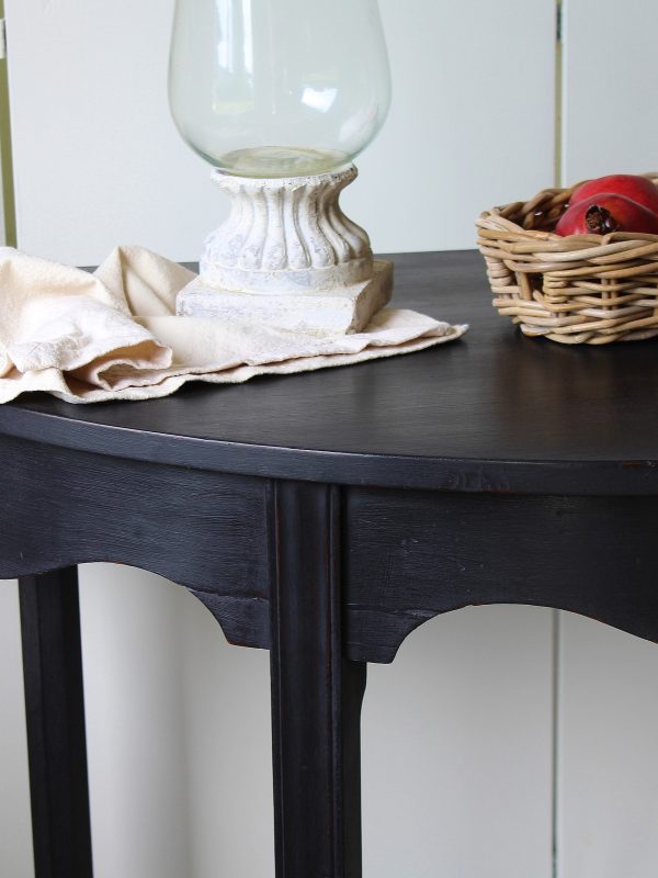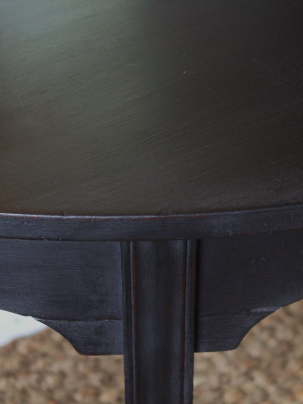 CHARMING BLACK “GUSTAVIAN PAINTED” 19th CENTURY ENGLISH MAHOGANY DEMI-LUNE CONSOLE