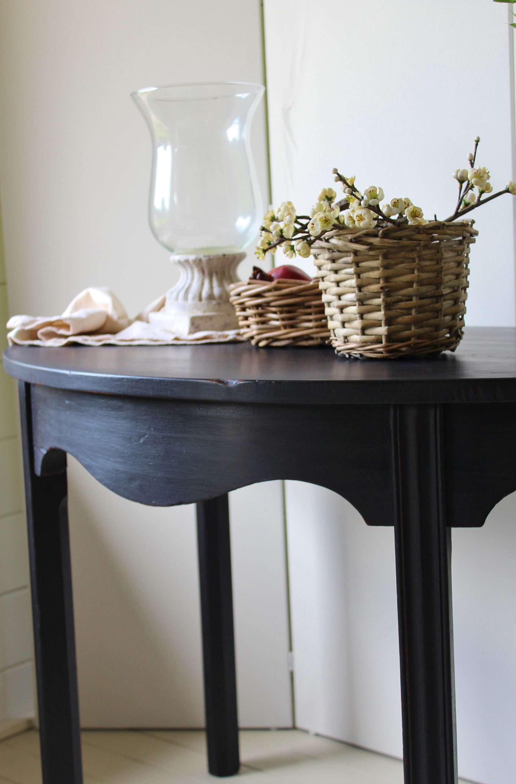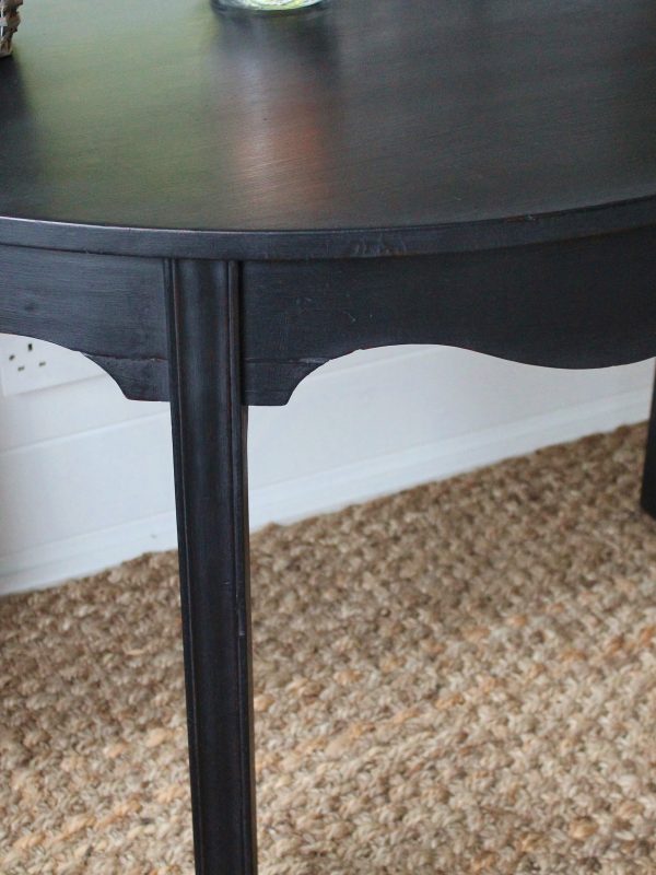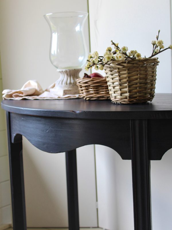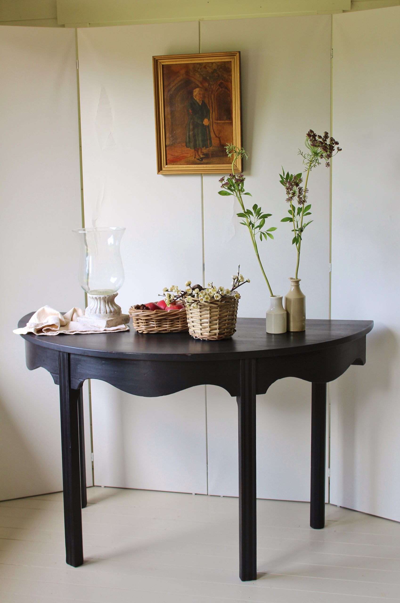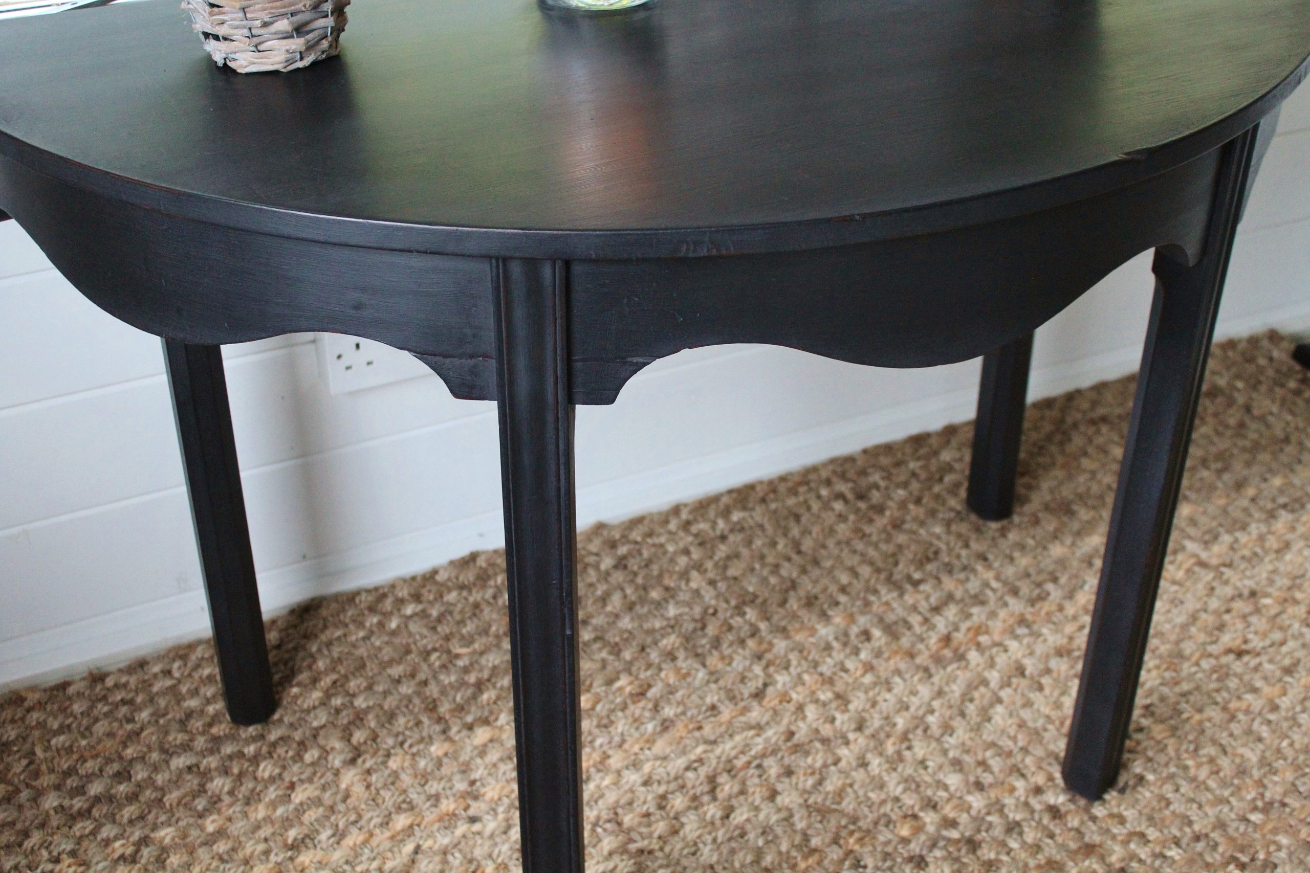 CHARMING BLACK “GUSTAVIAN PAINTED” 19th CENTURY ENGLISH MAHOGANY DEMI-LUNE CONSOLE
