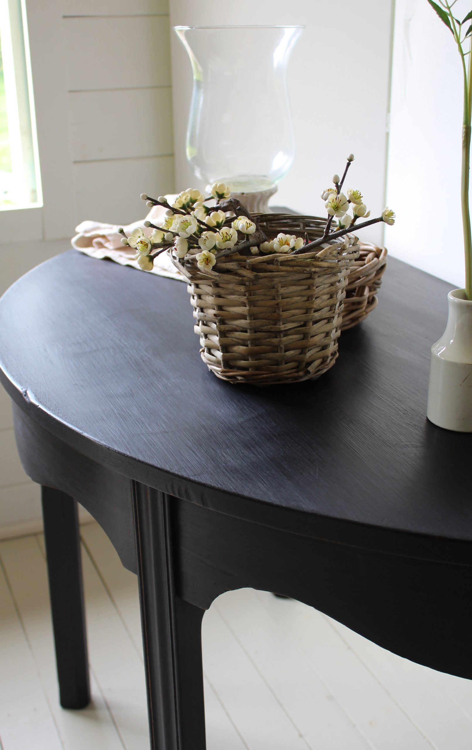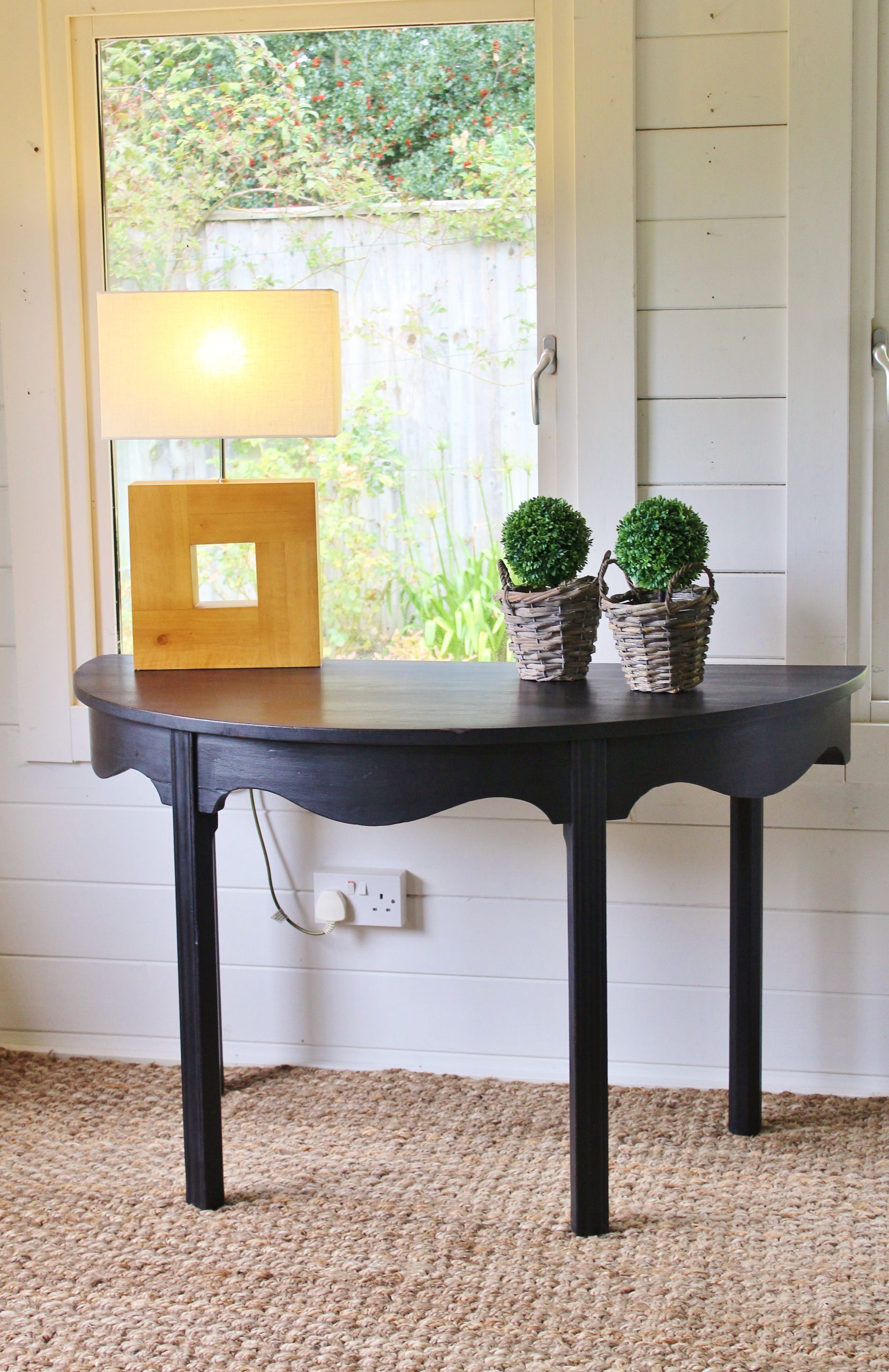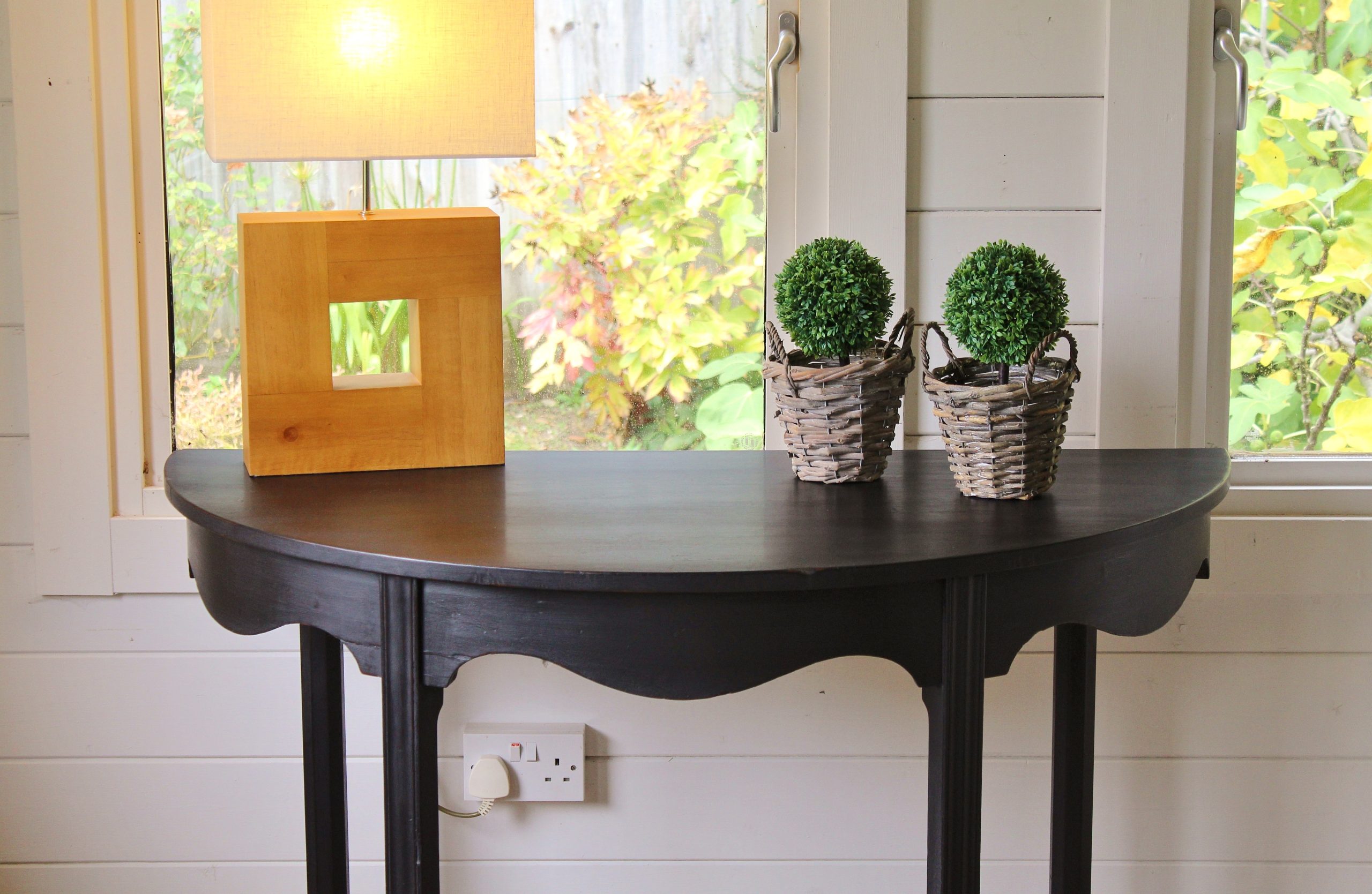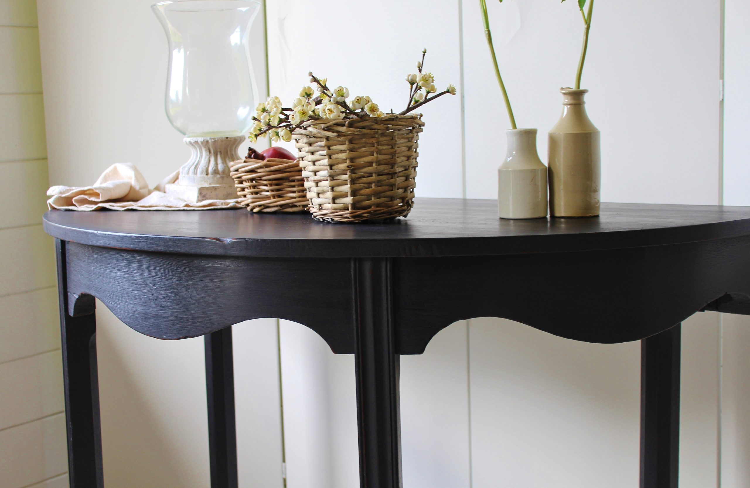 CHARMING BLACK “GUSTAVIAN PAINTED” 19th CENTURY ENGLISH MAHOGANY DEMI-LUNE CONSOLE