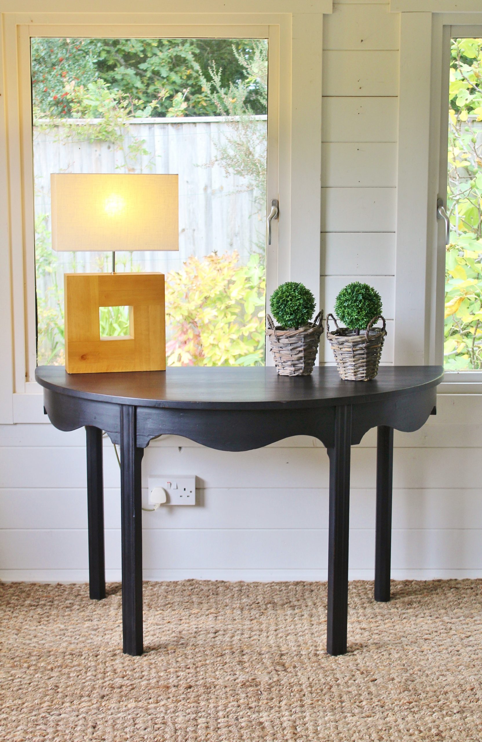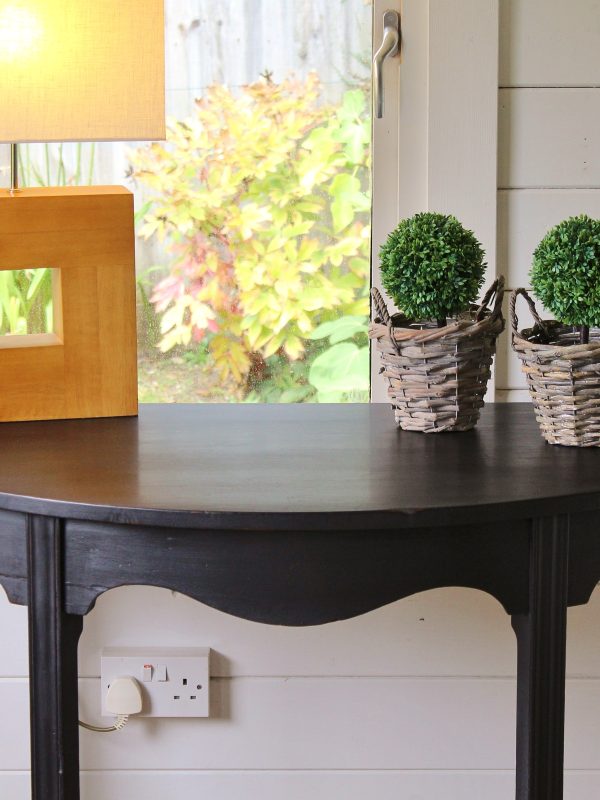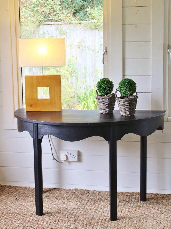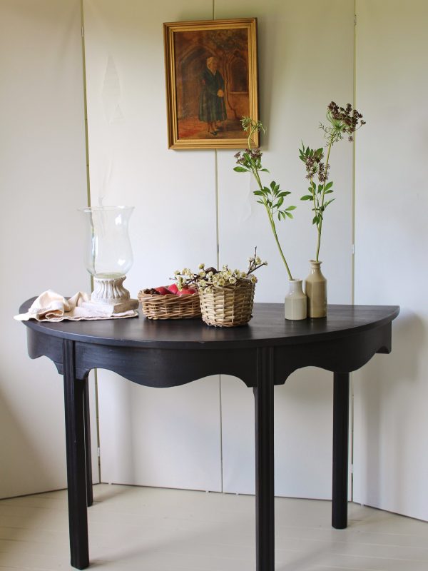 THIS CHARMING 19th CENTURY DEMI LUNE MAHOGANY SIDE CONSOLE TABLE IS IN GOOD SOLID CONDITION. CONSTRUCTED WITH ELEGANT SIMPLE LINES AND STYLE IT HAS BEEN HAND PAINTED IN SWEDISH STYLE WITH A SLIGHTLY WORN DISTRESSED WAXED FINISH. IT WOULD SUIT VERY WELL A HALLWAY POSITION OR INDEED SITTING ROOM. WITH IT’S ELEGANT GENTLY CURVED SKIRT RAISED UPON TAPERED SQUARED LEGS, IT WOULD MAKE A SUPER STATEMENT PIECE.