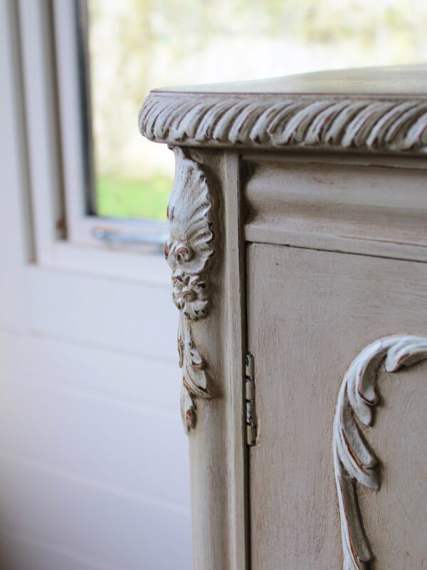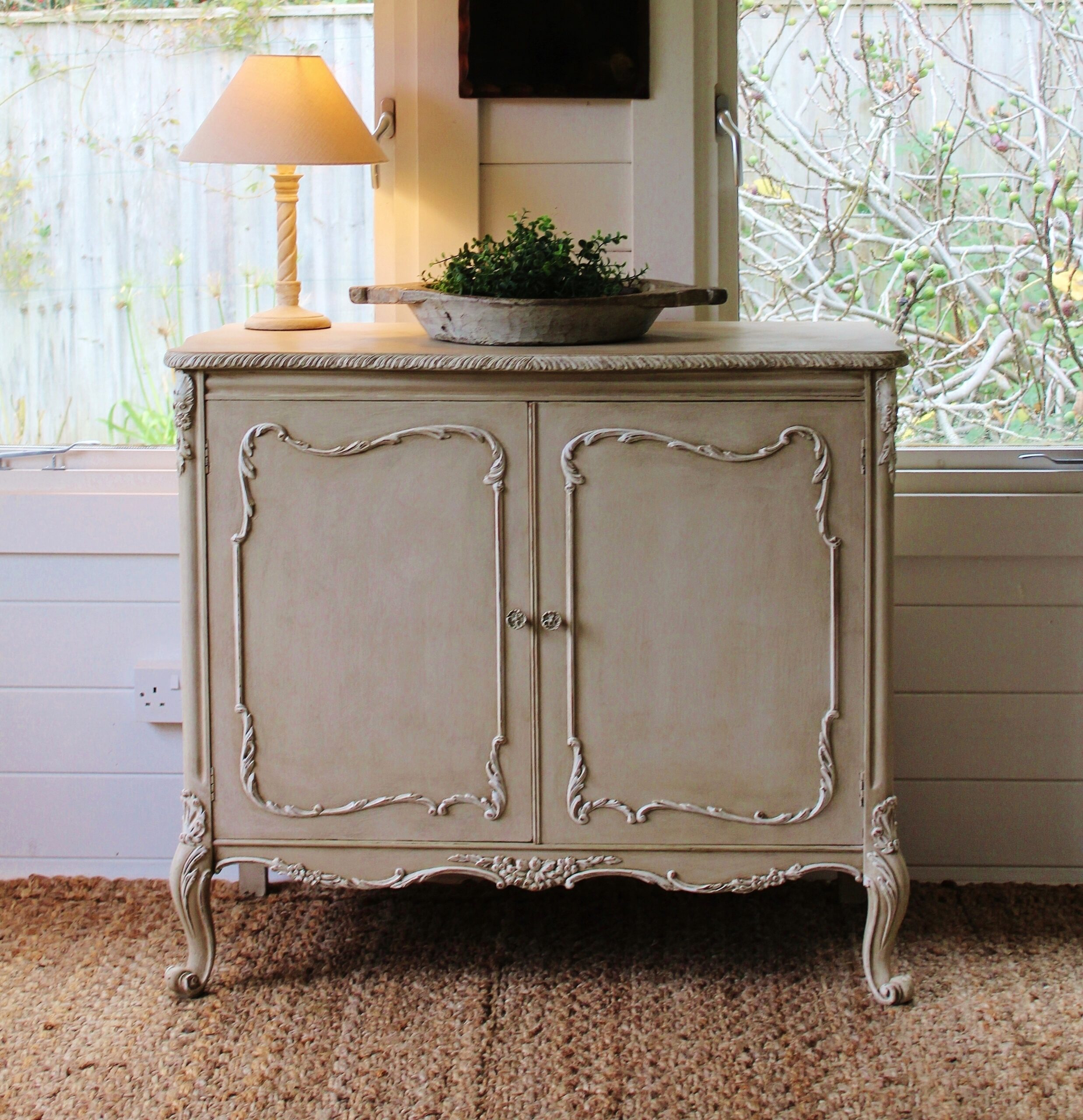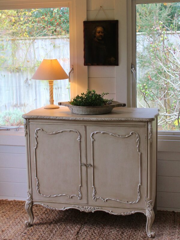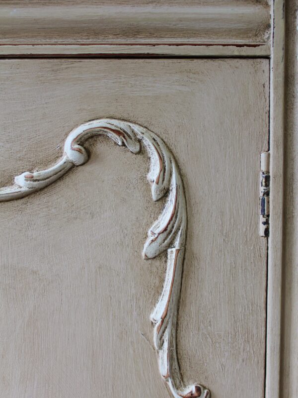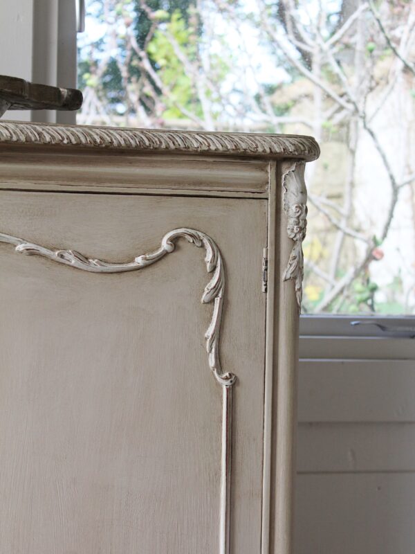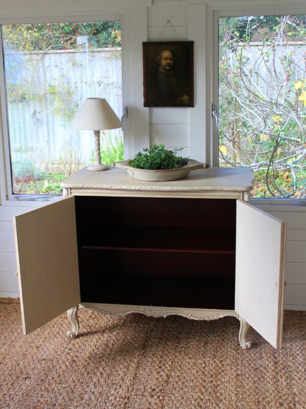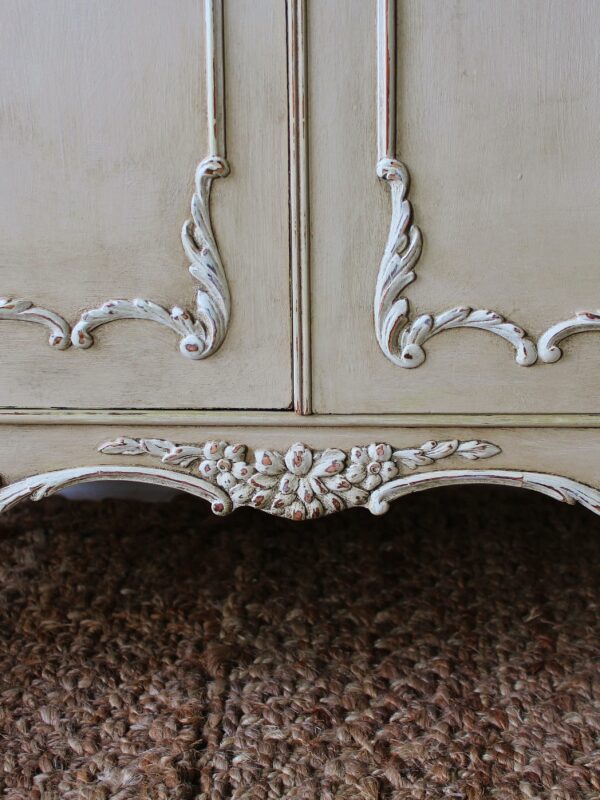 THIS VERY PRETTY FRENCH STYLE CABINET IS VERY TYPICAL OF THE LOUIS XI STYLE. IT HAS BEEN HAND “RUSTIC PAINTED” IN A PALE BROWN PUTTY COLOUR WITH AN ANTIQUE WHITE ON THE RAISED MOULDINGS. THE STUNNING MOULDED ACCENTS ON THIS SERPENTINE FRONTED PIECE REALLY STAND OUT BEAUTIFULLY AGAINST THE BUFF COLOUR BACKGROUND . THE CABINET FEATURES A TWO DRAWER FRONTAGE WITH THEIR ORIGINAL KNOBS, ESCARGOT FEET AND MOULDINGS TO THE DOORS, SIDES AND SKIRT.