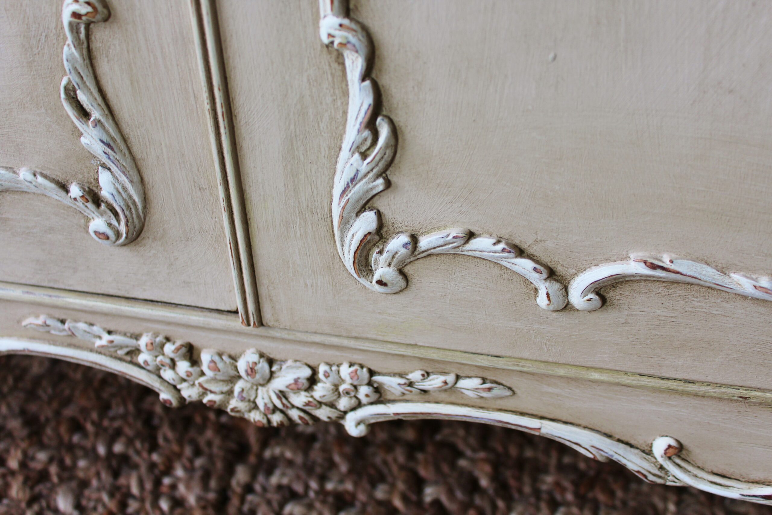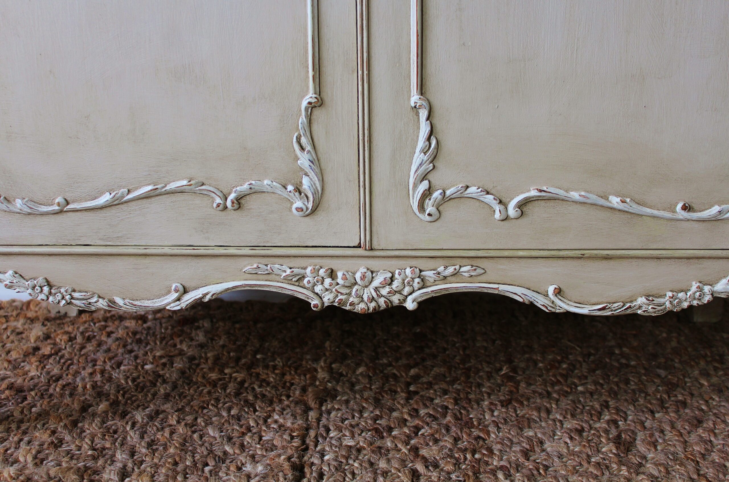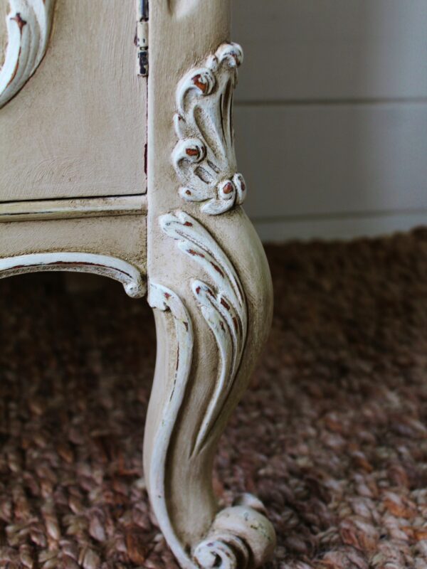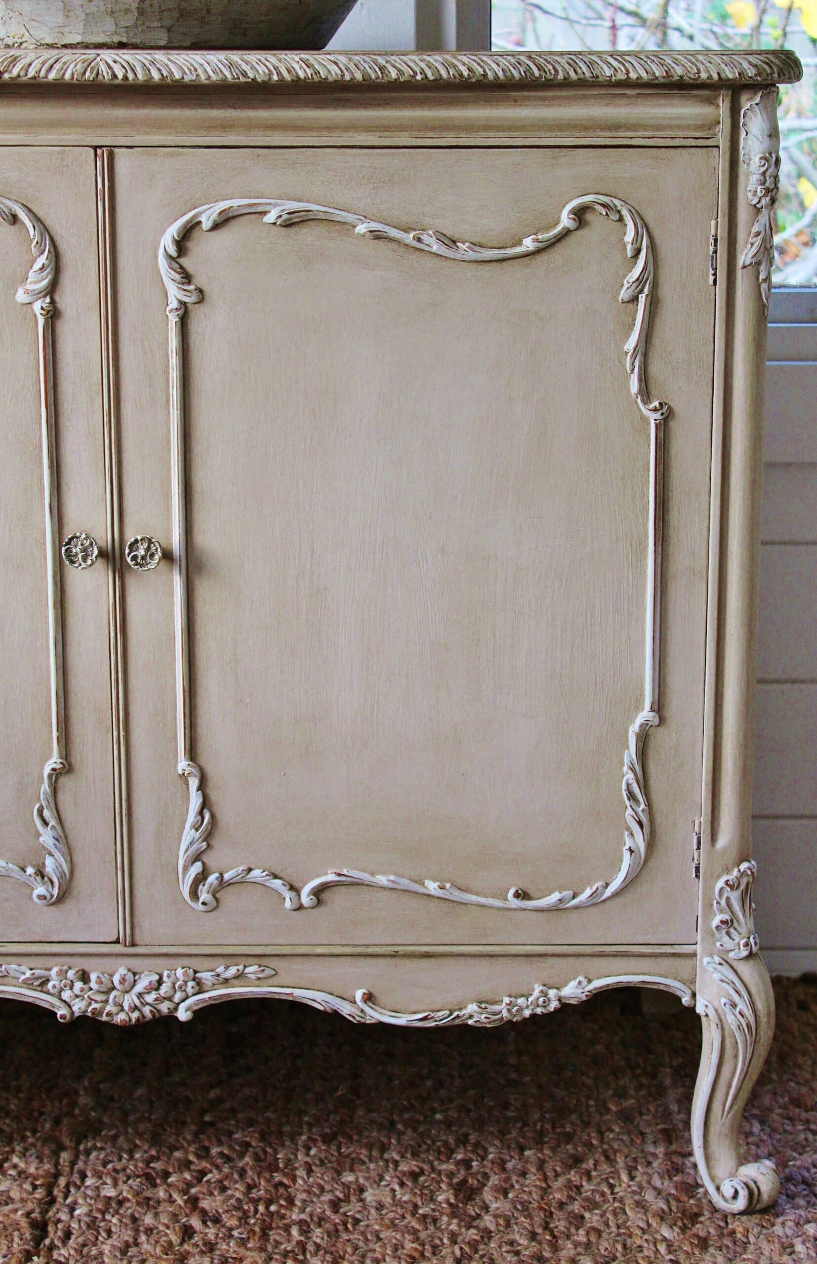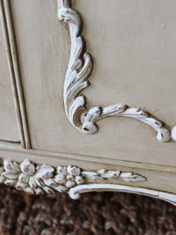 THIS VERY PRETTY FRENCH STYLE CABINET IS VERY TYPICAL OF THE LOUIS XI STYLE. IT HAS BEEN HAND “RUSTIC PAINTED” IN A PALE BROWN PUTTY COLOUR WITH AN ANTIQUE WHITE ON THE RAISED MOULDINGS. THE STUNNING MOULDED ACCENTS ON THIS SERPENTINE FRONTED PIECE REALLY STAND OUT BEAUTIFULLY AGAINST THE BUFF COLOUR BACKGROUND . THE CABINET FEATURES A TWO DRAWER FRONTAGE WITH THEIR ORIGINAL KNOBS, ESCARGOT FEET AND MOULDINGS TO THE DOORS, SIDES AND SKIRT.